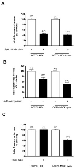 Rapid regulation of ASP+ uptake mediated by hOCT2, stably expressed in HEK cells (hOCT2-HEK) or in MDCK cysts (hOCT2-MDCK cysts). The regulation was investigated by inhibiting calmodulin with calmidazolium (5 µM) (A), p56lck tyrosine kinase with aminogenistein (10 µM) (B) and CKII with TBBz (10 µM) (C). Initial uptake rates of ASP+ after 10 min of incubation with these different inhibitors are presented as percentages of the controls. Values are means ± SEM. The numbers on the columns show the number of replicates measured in at least three independent experiments. * A statistically significant difference to the control experiments (p < 0.05, unpaired t-test).