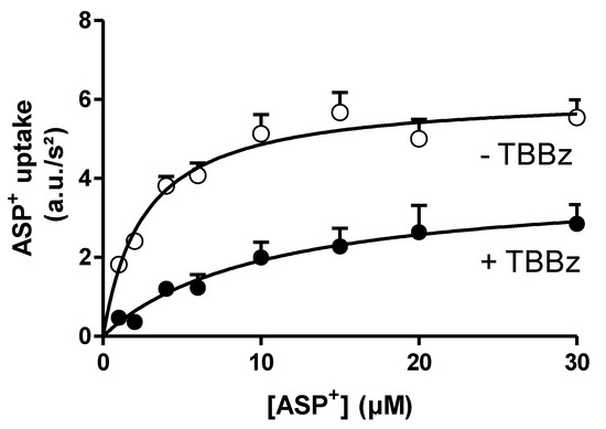 Effect of the inhibition of CKII with 10 µM TBBz on the ASP+ transport kinetics measured in hOCT2-MDCK cysts. The open dots show the results of experiments where the cells were preincubated for 10 min with a control solution (-TBBz) before measuring ASP+ uptake. Closed symbols represent the results of experiments performed after 10 min of preincubation with 10 µM TBBz (+TBBz). The kinetic parameters were Km = 2.6 ± 0.2 µM and Vmax = 6.1 ± 0.1 a.u./s2 (N = 3 with a total of 14–15 replicates for every concentration) for -TBBz and Km = 10.4 ± 4.4 µM and Vmax = 3.9 ± 0.8 a.u./s2 (N = 3, with a total of 6–15 replicates for every concentration) for +TBBz. These changes in Km and Vmax were statistically significantly different (unpaired t-test, p < 0.05).