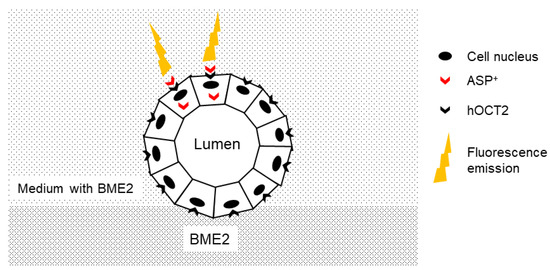 Schematic representation of ASP+ uptake experiments in hOCT2-MDCK cysts. The hOCT2-MDCK cells seeded on a BME2 matrix and cultured in a medium containing basement membrane extract (BME2) formed a cyst with a central lumen, and hOCT2 was expressed in the basolateral membrane domain. After ASP+ addition, upon binding of ASP+ to hOCT2 and uptake into the cells, a fluorescence emission was detected.