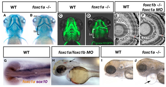 Zebrafish foxc1a mutants, as well as foxc1a/foxc1b double mutants, have craniofacial defects consistent with abnormalities in the facial structure of ARS patients. In these patients, hypertelorism (increased space between the eyes) and a prominent forehead are often described. In zebrafish, foxc1a and foxc1b are expressed in the neural crest cells that populate the first and second pharyngeal arches that give rise to anterior jaw structures. Mutation of foxc1a alone results in craniofacial dysmorphism [27,37] including underdeveloped symplectic cartilage and like many ocular phenotypes observed in these mutants, severity increased in double foxc1a/foxc1b mutants. Phenotypes in double homozygous mutants included under-developed palatoquadrate and hyomandibula cartilages [37], demonstrating that foxc1a and foxc1b play critical roles in the development of anterior facial cartilages (Figure 1A–D, foxc1a). Analysis of genetic targets downstream of foxc1 revealed both foxc1a and foxc1b regulate Sox9-dependent expression of cartilage specification genes, accounting for reduced jaw structures in these animals. While Foxc1 does not directly regulate sox9 expression, loss of foxc1 paralogs in zebrafish causes a decrease in chromatin accessibility for transcription factors such as Sox9 in chondrocytes [38], and thus supports the hypothesis that Foxc1 drives cartilage development through a chromatin remodeling mechanism.