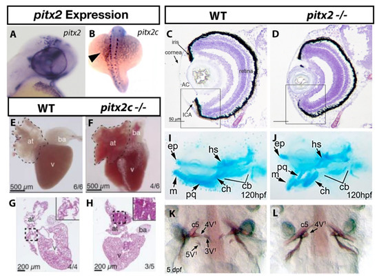 ARS related phenotypes in zebrafish due to loss of pitx2 function. Expression of pitx2a is found within the brain and periocular mesenchyme (A) [22] while pitx2c is observed in a “left sided” pattern in the lateral plate mesoderm (B) [27]. The anterior ocular chamber is reduced in pitx2 homozygous mutants when compared to wildtype siblings (C,D) [33]. Homozygous pitx2c mutants display hypoplastic cardiac atria and increased fibrosis when compared to wildtype siblings (E–H) [35]. Underdeveloped jaw cartilages are also observed in pitx2 mutants (I,J) [30] as is delayed or absent pharyngeal tooth (3V1 and 5V1) development (K,L) [33]. Abbreviations: atrium (at), bulbus arteriosus (ba), ventricle (v), Anterior, segment (AC), ethmoid plate (ep), hyosympletic (hs), Meckel’s cartilage (mc), palatoquadrate (pq), ceratohyal (ch), ceratobranchial (cb).