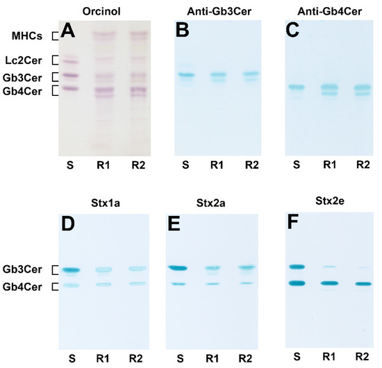 Figure 1 shows the orcinol stain of the neutral GSLs from serum-free cultivated pHCoEpiCs and the immunochemical identification of Gb3Cer and Gb4Cer performed in parallel with specific antibodies as well as their recognition by the three employed Stx subtypes Stx1a, Stx2a and Stx2e. The neutral GSLs from two independently produced biological replicates (R1 and R2) were isolated from the lipid extracts and purified by anion-exchange chromatography. The orcinol-stained TLC-separated GSLs of pHCoEpiCs (Figure 1A) suggest the presence of an abundant Gb4Cer and a comparably weak Gb3Cer double band, respectively. The supposed glycan epitopes could be confirmed using the anti-Gb3Cer (Figure 1B) and the anti-Gb4Cer antibody (Figure 1C), indicating clearly immunostained GSL doublets. Experience from previous GSL analyses of various types of human cells suggests ceramide lipoforms harboring a long-chain C24 fatty acid in the upper and a short-chain C16 fatty acid in the lower band of the respective Gb3Cer and Gb4Cer double bands with a uniform sphingosine (d18:1) as the sphingoid base. Stx1a and Stx2a exhibit preferential recognition of Gb3Cer, especially of the lipoform with the long-chain fatty acid in the upper band, accompanied by weak but clearly detectable binding to the Gb4Cer upper band as shown in Figure 1D and Figure 1E, respectively. In contrast, Stx2e is characterized by preferred binding towards Gb4Cer and extremely low interaction with Gb3Cer (Figure 1F). Threshold concentrations of the minor Gb3Cer and Gb4Cer species carrying the short-chain fatty acid appearing as lower GSL bands of the doublets obviously prevented binding of the three Stx-subtypes.