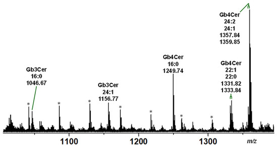Overview MS1 spectrum of Stx receptor GSLs Gb3Cer and Gb4Cer of serum-free cultivated pHCoEpiCs. The spectrum was obtained from a GSL preparation of replicate 2 (R2; see Figure 1) showing the various lipoforms of Gb3Cer and Gb4Cer harboring sphingosine (d18:1) as the sole sphingoid base and variable fatty acids as indicated. All GSLs were detected as monosodiated species using the positive ion mode and are listed in Table 1. The [M+Na]+ ions of Gb3Cer at m/z 1046.67 and 1156.77 and those of Gb4Cer at m/z 1249.74 and 1357.84/1359.85 were selected for MS2 analysis as shown in Figure 3 and Figure 4, respectively. The asterisks mark polyethylene glycols (PEGs) appearing as serial contaminations in the GSL preparation.