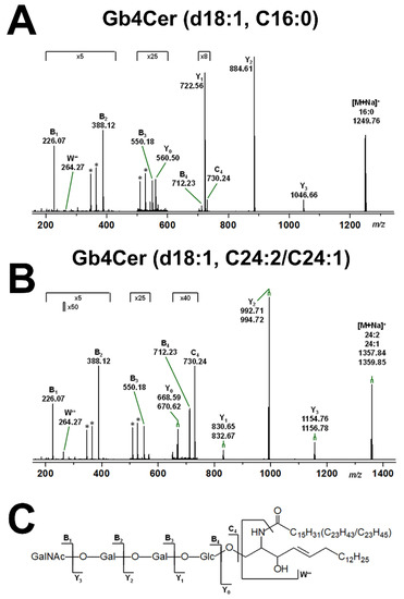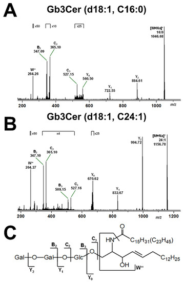 Mass spectrometric fragmentation analyses are exemplarily shown for the Gb3Cer lipoforms Gb3Cer (d18:1, C16:0) and Gb3Cer (d18:1, C24:1) in Figure 3A and Figure 3B, respectively, with an explanatory fragmentation scheme in Figure 3C regarding the fragment ions obtained by collision-induced dissociation (CID) experiments. This fragmentation technology allows for individual GSL analysis with respect to monosaccharide sequencing of the oligosaccharide portion and determining the ceramide structure composed of a sphingoid base and a fatty acid moiety. Since the pHCoEpiCs were propagated in serum-free medium, the uptake of exogenous GSLs from serum supplement can be excluded and identified Stx receptor GSLs can be considered as true GSLs of colon epithelial cells.