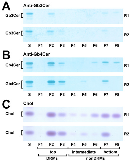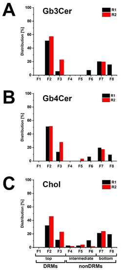 The averaged values of Gb3Cer of the summed top fractions (DRMs F1-F3) of replicate 1 and replicate 2 account for 68.5% and those of the summed bottom fractions (nonDRMs F7-F8) of the two replicates amount to 27.9% (for calculation refer to Table S1 of the Supplementary Materials). Similar partition values were calculated from densitometric scanning of Gb4Cer with an average of 71.9% in the added top fractions (DRMs F1–F3) and averaged 23.3% in the added bottom fractions (nonDRMs F7-F8) when compared to the distribution pattern of Gb3Cer. Cholesterol disseminates on average to 56.4% to the summed top fractions (DRMs F1-F3) and to averaged 32.2% to the summed bottom fractions (nonDRMs F7-F8). These values suggest association of Gb3Cer and Gb4Cer with microdomains in the liquid-ordered membrane phase, substantiated by peak prevalence of averaged 54.2% of Gb3Cer, 51.3% of Gb4Cer and 39.3% of cholesterol in the single classical DRM fraction F2 of the eight gradient fractions (calculated from relative scanning values listed in Table S1 of the Supplementary Materials). Collectively, prevalence of Gb3Cer and Gb4Cer in the DRMs suggest their possible association with membrane clusters also known as lipid rafts.