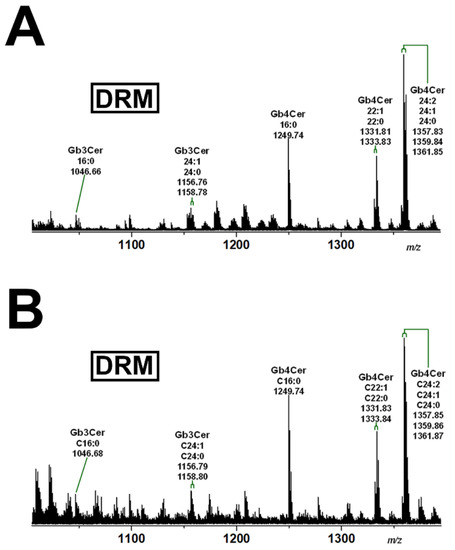 4.5. Analysis of Phospholipids and Glycosphingolipids in DRM and nonDRM Fractions