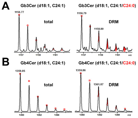 Expanded molecular ion region of Gb3Cer C24 species detected in the total GSL preparation and the GSL sample of DRM fraction F2 (A) and the Gb4Cer counterparts (B) of serum-free cultivated pHCoEpiCs. The calculated isotope distribution of Gb3Cer and Gb4Cer with Cer (d18:1, C24:1) of the total GSL preparation (left side of panels A and B, respectively) and Gb3Cer and Gb4Cer with Cer (d18:1, C24:1/C24:0) of the GSL sample of DRM fraction F2 (right side of panels A and B, respectively) is marked with open red squares. The red coloured areas at the tips of the signal peaks indicate the additionally occurring Gb3Cer and Gb4Cer lipoforms with Cer (d18:1, C24:0) moieties.