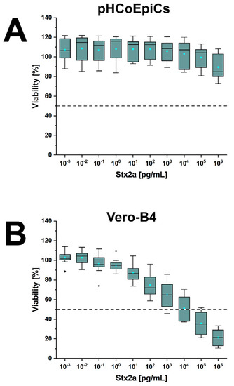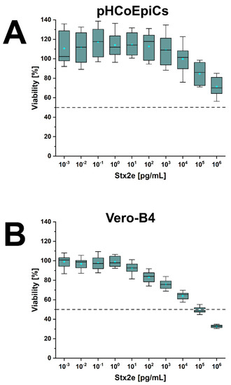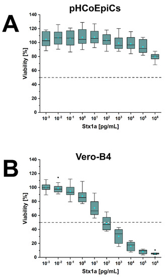 In summary, pHCoEpiCs were largely tolerant against the cytotoxic action of Stx1a and Stx2a, showing only a mild but significant cytotoxic response towards Stx2e. However, using 1 µg/mL as the highest toxin concentrations, no 50% cytotoxic doses could be determined.