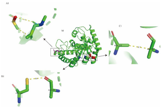 The three-dimensional (3D) model of wild type (M) and three potential mutation pairs, D90/A93 (A1), C175/A209 (B1) and A207/A243 (C1). The 3D molecular visualization was performed with PyMOL software.