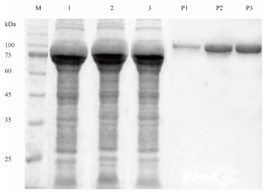To obtain the purified protein fraction, the wild-type DPEase and its mutants were fused with a C-terminal 6-histidine-tag, followed by purification with Ni2+-chelating affinity columns. The molecular masses of D90C-A93C, C175-A209C, and A207C-A243C measured by SDS-PAGE were all about 88.5 kDa, consistent with the theoretical molecular weight (Figure 2).