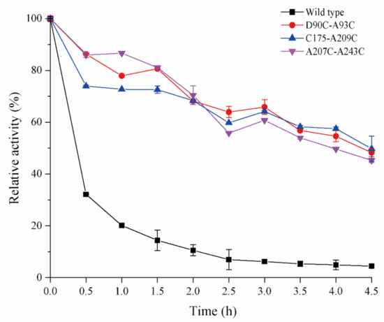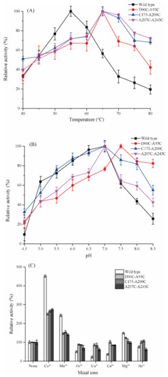 The optimum pH of D90C-A93C shifted from 7.0 to 7.5, after introduction of the disulfide bridge and it was more stable at pH 8.0 than the other two mutants, retaining 81% of its activity. C175-A209C and A207C-A243C had the same optimal pH values (7.0) as the wild type; the relative activity of C175-A209C was more than 80% in the pH range 6.0–7.5 (Figure 3B).