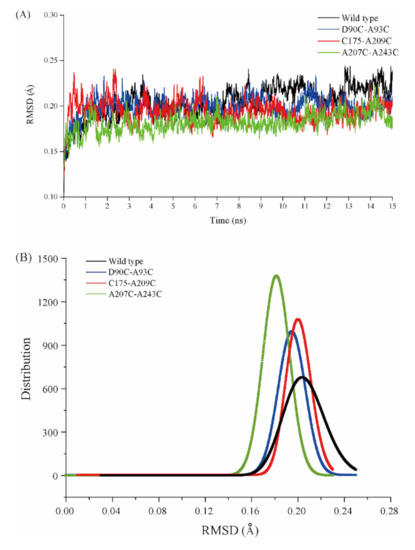 To investigate the changes in the mutants’ structural flexibility at high temperatures, the root mean square deviation (RMSD) and corresponding root mean square fluctuation (RMSF) per residue of the wild-type and the three stabilized mutants were predicted by MD simulation. A low RMSD typically corresponds to high rigidity and potentially high thermostability of the overall structure, and a lower RMSF indicates more rigidity of an individual amino acid residue [33]. At 328 K (55 °C), the MD simulation trajectories of the mutants were almost equal to that of the wild-type, however, the average RMSD was higher for all the residues of wild-type than that of the three mutants (Figure 5A). The RMSD values of Cb-DPEase mainly averaged 0.22 Å while those of D90C-A93C, C175-A209C and A207C-A243C varied around 0.22 Å, 0.20 Å and 0.19 Å, respectively, and the RMSD value distributions greater than 0.23 of the wild type were significantly higher than those of the mutants, indicating that the mutants were much more rigid than Cb-DPEase (Figure 5B). The RMSF values of D90C-A93C, C175-A209C, and A207C-A243C were also markedly reduced at the residue positions (90/93, 175/209, 207/243), where the disulfide bridge was introduced (Figure 5C).