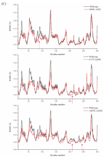 The change of B-factor (a measure of conformational flexibility) around the mutation sites was provided by modeling tools and visualized in Figure 6A. The chain sections around D90/A93, C175/A209 and A207/A243 in the wild-type were relatively flexible, although the flexibility of the loop structure (A1) around D90/A93 was lower than the other two sections. The B-factor around the mutant disulfide bridges in D90C-A93C, C175-A209C, and A207C-A243C had clearly decreased, reflecting the increased conformational stiffness resulting from the introduction of the disulfide bridges.