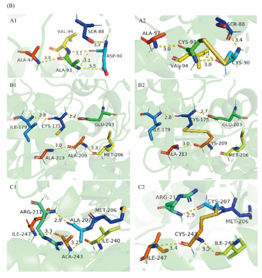 According to the modelled 3D structure (Figure 6B), although the number of hydrogen bonds in D90C-A93C and C175-A209C decreased, the disulfide bridges made a major contribution to the increased rigidity of the mutant structures, leading to a significant increase in thermostability. Furthermore, the consolidation of intramolecular hydrogen bonding network in mutants C175-A209C and A207C-A243C actively contributes to the stability enhancement of DPEase (Figure A1), and it might be another reason for the increased thermal stability of the two mutants, in addition to the formation of the disulfide bonds [44].