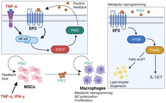 Schematic representation of the crosstalk between mesenchymal stem cells (MSCs) and macrophages. Pro-inflammatory cytokines such as TNF-α secreted by macrophages stimulate MSCs to produce and secrete prostaglandin E2 (PGE2). MSC-secreted PGE2 promotes lipid droplet biogenesis in macrophages and mediates macrophage polarization. PGE-2-mediated activation of the EP2 receptor induces additional COX-2 expression, further amplifying downstream PGE2 generation. The figure was created using BioRender.com (accessed on 14 September 2021).