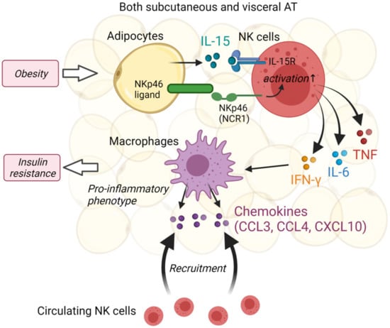 Schematic representation of the function of NK cells in adipose tissue homeostasis. Both SAT and VAT express IL-15 and IL-15Rα, and IL-15 levels are higher in obese patients than in healthy patients. Obesity induces the upregulation of NKp46 (NCR1) ligand expression in adipocytes, which activates adipose tissue-resident NK cells to rapidly increase IFN-γ production, thereby promoting the accumulation of pro-inflammatory M1 macrophages and insulin resistance. Macrophages increase the production of chemokines and let them further enhance NK cells recruitment. The figure was created using BioRender.com (accessed on 14 September 2021).