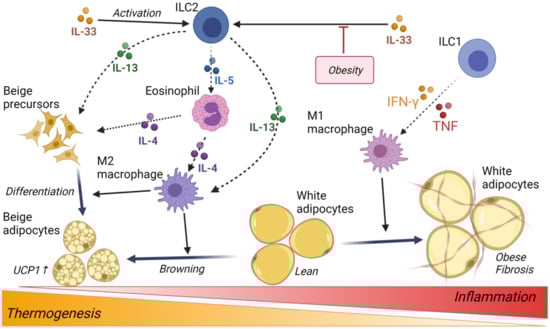 Group 2 innate lymphoid cells (ILC2) respond to epithelial cell-derived cytokine IL-33, activate and accumulate in various organs and tissues, and then secrete IL-5 and IL-13 to initiate type 2 innate and adaptive immune responses. ILC2 has been identified in the white adipose tissue (WAT) of mice, which plays a role in the maintenance of M2-like macrophage and eosinophils to regulate metabolic homeostasis []. In human subcutaneous WAT, ILC2 was identified as a lineage negative, CD25 (IL-2Rα)-positive and CD127 (IL-7Rα)-positive cell populations, which expressed GATA-3 and IL-33R consistent with ILC2 in other tissues, and their frequencies in obese subjects were decreased compared with non-obese controls as well as in subcutaneous WAT of mice []. IL-33 plays a critical role in the maintenance and activation of ILC2 in WAT [,]. Activated ILC2 enhances the proliferation and commitment of beige adipocyte precursors, where IL-13 and eosinophil-derived IL-4 promote the growth of beige fat via IL-4 receptor signaling. Finally, the browning or beiging of WAT and white adipocytes stimulates thermogenesis and increases energy expenditure; thus, ILC2 in WAT has been implicated in the regulation of obesity and metabolic dysfunction [] (Figure 3).