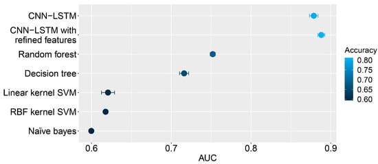 Performances of all classifiers, namely, CNN-LSTM, CNN-LSTM with refined features, random forest, decision tree, linear kernel SVM, RBF kernel SVM, and Naïve Bayes classifier. Each dot indicates the mean area under the receiver operating characteristic (ROC) curve of a classifier. The error bar indicates the standard deviation. Dot color reflects accuracy, as indicated in the legend.
