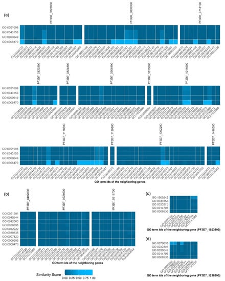 The similarities of the GO terms of four unknown function genes, including (a) PF3D7_1303800, (b) PF3D7_1201000, (c) PF3D7_1248700, and (d) PF3D7_0401800, plus the GO terms of their neighbors. The names of their neighboring genes are listed at the top of each block. The GO terms of the unknown function P. falciparum genes are listed on the y-axis, and the GO terms of their neighboring genes are listed on the x-axis. The heat map color reflects the similarity score, as indicated in the legend.