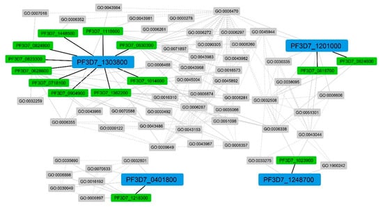 The network shows the connections among PF3D7_1303800, PF3D7_1201000, PF3D7_1248700, and PF3D7_0401800, their neighboring genes, and their corresponding GO terms. Notice that PF3D7_1303800 has ten neighboring genes while the others have only one or two neighboring genes. Therefore, many GO terms can be found for PF3D7_1303800. There are some commonly shared GO terms among PF3D7_1303800, PF3D7_1201000, and PF3D7_1248700.