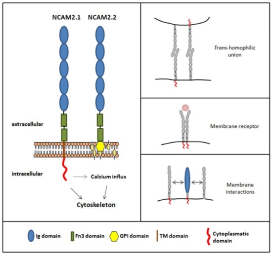 The mammalian NCAM family has two members: NCAM1 and NCAM2 [,]. The two proteins have similar ectodomains, each of them containing five immunoglobulin domains and two fibronectin type III domains [], Figure 1. NCAM1 was the first cell adhesion molecule identified in the nervous system and has been extensively studied. The different isoforms of NCAM1 (180KDa, 140KDa and 120KDa) have the same extracellular domain, but different transmembrane and cytosolic domains as a result of alternative splicing of the gene. The NCAM180 isoform is mostly expressed in neurons in the adult brain; NCAM140, in neurons in both embryonic and adult stages; and NCAM120, mostly in glia in adult stages.