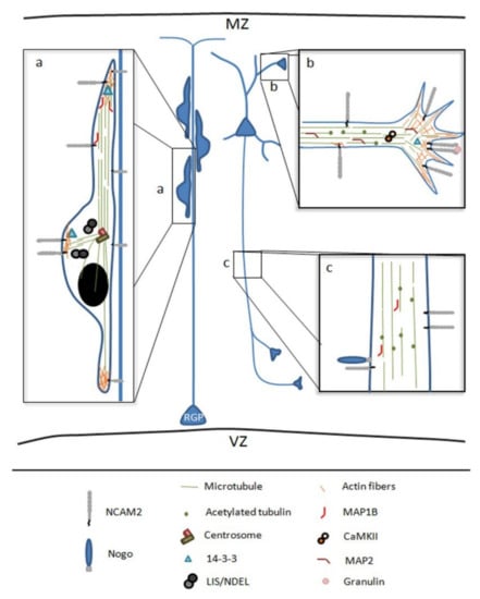 Schematic representation of NCAM2 functions and interactions during brain development. (a) NCAM2 is involved in neuronal migration, NCAM2 protein levels have been associated with an aberrant neuronal migration and layering positioning in the cortex. NCAM2 interacts with different cytoskeletal associated proteins which control cytoskeleton dynamics during neuronal migration. (b,c) NCAM2 has a crucial role during neuronal differentiation interacting with different proteins that are necessary for dendritic tree development and axon elongation. NCAM2 depletion alters the growth cone mobility and microtubules stability. Microtubule associated protein 1B, MAP1B; Microtubule associated protein 2, MAP2; and Calcium/calmodulin-dependent protein kinase type II, CaMKII. Lissencephaly-1/Nuclear distribution protein nudE-like1, LIS/NDEL; radial glia progenitors, RGP; marginal zone, MZ; and ventricular zone, VZ.