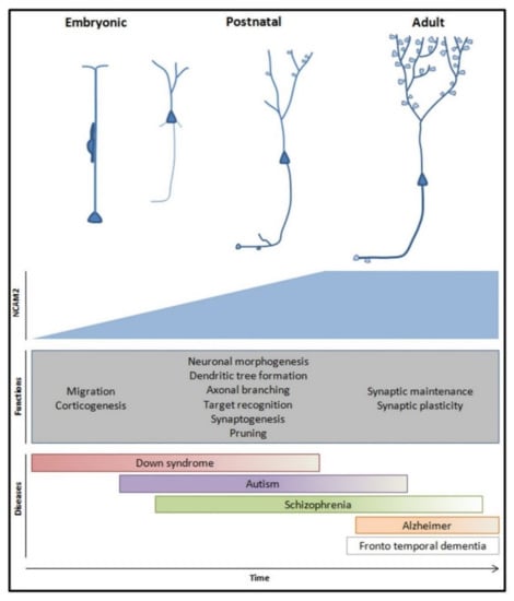 Brain formation involves a myriad of mechanisms, including temporal and spatial regulations during neuronal development that only occur in vivo []. The study of the mechanisms that regulate the polarization and development of neurons in vitro made it possible to identify proteins that have an implication at the physiological level []. Not only that, but the complexity of in vivo models has demonstrated the relevance of the extracellular matrix and cell adhesion molecules in the overall development of the brain. In this sense, adhesion proteins participate in different processes of neuronal development, such as neuronal migration, positioning, morphogenesis, development of dendritic and axonal compartments, and synaptogenesis [,,,]. In vivo, NCAM2 expression progressively increases during neuronal development; NCAM2 is involved in neuronal migration, cell positioning during corticogenesis, neuronal differentiation and synaptogenesis in the olfactory bulb, neocortex and hippocampus. In these regions, NCAM2 participates in the development of dendrites and axons, the establishment of connections, and the regulation of synaptic plasticity [,,], see Figure 2.
