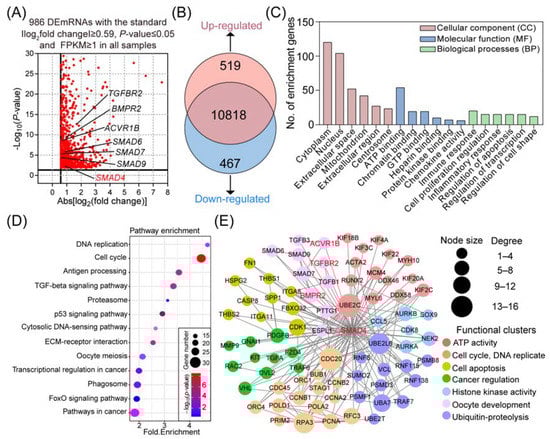 Reanalysis of the transcriptomic alteration in porcine GCs after SMAD4 knockdown. (A) Volcano plot of the identified DEmiRNAs. The DEmRNAs in porcine GCs treated with SMAD4 siRNA are shown as red dots. x-axis and y-axis are described according to |log2(fold change)| and −log10(p-value), respectively. (B) Expression pattern distribution of DEmRNAs under SMAD4-silencing. (C) Gene Ontology (GO) analyses of the DEmRNAs in porcine GCs after knockdown of SMAD4. The top 6 significantly enriched function terms in CC, MF, and BP categories were represented. (D) KEGG pathway analyses of the DEmRNAs in porcine GCs under SMAD4 knockdown and 13 significantly enriched pathways were presented. (E) Identification of the SMAD4-mediated gene–function network. The function-known DEmRNAs are shown as circles (nodes). Edges indicate the potential interaction between different nodes. The size of nodes reflected their degree in the network. Nodes are clustered according to the biological functions as indicated.