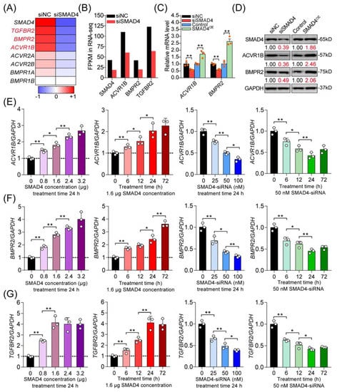 SMAD4 feedback induces the transcription of its upstream receptor genes (ACVR1B, BMPR2, and TGFBR2) in porcine GCs. (A) Heat map showing the expression pattern of TGF-β family signaling receptors in porcine GCs after SMAD4 silencing (siSMAD4). The color scale indicates the expression degree, increase (red), and decrease (blue). (B) Expression levels (FPKM) of SMAD4, ACVR1B, BMPR2, and TGFBR2 in SMAD4-silenced porcine GCs according to RNA-seq. (C,D) The mRNA (C) and protein (D) levels of ACVR1B and BMPR2 in SMAD4-expressed or -inhibited porcine GCs were determined by qRT-PCR and Western blotting assays (n = 3). (E–G) The mRNA levels of ACVR1B (E), BMPR2 (F), and TGFBR2 (G) in porcine GCs treated with pcDNA3.1-SMAD4 or SMAD4-siRNA with different concentrations and treatment times as indicated were analyzed by qRT-PCR (n = 3). The data in (C,E–G) were normalized by GAPDH and are shown as the mean ± S.D. of three independent experiments. p-values were calculated by a two-tailed Student’s t-test, * p < 0.05, ** p < 0.01.