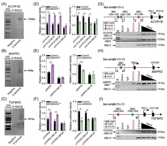 SMAD4 acts as a TF and binds to the core promoter of pig ACVR1B, BMPR2, and TGFBR2. (A–C) Identification of the transcription start sites (TSS) of pig ACVR1B, BMPR2, and TGFBR2 by RACE assay. Gel images depicting the 5′-RACE amplification products of pig ACVR1B (A), BMPR2 (B) and TGFBR2 (C). 5′-terminal indicates the gene-specific primer (GSP) addition and negative means no GSP primer. The size of each band is indicated by an arrow. (D–F) The effects of SMAD4 on the promoter activity of pig ACVR1B (D), BMPR2 (E) and TGFBR2 (F) with wild-type or mutant-type SBEs were detected by luciferase activity assays (n = 3). The location of different SBE motifs within the promoter of pig ACVR1B, BMPR2, and TGFBR2 were analyzed and shown in Figure S3 and (G–I). (G–I) Potential binding sites of SMAD4 within the core promoter of pig ACVR1B (G), BMPR2 (H), and TGFBR2 (I) were identified by ChIP assays. Different SBE motifs were indicated by diamonds with different colors. Specifically, red, blue, and green diamonds indicate “CAGA”, “GTCT”, and “GTCTG” motifs, respectively. SBE-X indicates the negative control for ChIP assays. The data in (D–F) are shown as the mean ± S.D. with three independent experiments. p-values were calculated by a two-tailed Student’s t-test, ** p < 0.01.