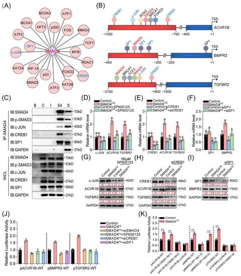 CREB1, c-JUN, and SP1 are essential coactivators for SMAD4 feedback regulation of its upstream receptors. (A) Identification of the SMAD4-interacted protein in mammalian GCs. The interactions between SMAD4 and 21 different TFs or coregulators in mammals were obtained from the STRING v11.0 database and visualized by Cytoscape v3.7.2 software. (B) Diagram showing the location of the binding motifs of candidate transcriptional coregulators within the core promoter of pig ACVR1B, BMPR2, and TGFBR2. The core promoter of each gene is shown as a red column. The SBEs identified in this study are labeled in red font, and the binding motifs of c-JUN, CREB1, and SP1 are indicated in blue font. (C) The physical interactions between SMAD4 and candidate coregulators (c-JUN, CREB1, and SP1) in porcine GCs were identified using IP assay. B, blank group; C, control group; I, IgG group; S4, anti-SMAD4 group; S, supernatant. WCL indicates the whole cell lysis which was used as positive control. (D–I) Porcine GCs were treated with 150 μM of SP600125 (D,G), siCREB1 (E,H), or siSP1 (F,I) in the absence or presence of SMAD4 stimulation for 24 h and 48 h, and the mRNA and protein levels of candidate coregulators (c-JUN, CREB1, and SP1) and SMAD4 upstream receptors (ACVR1B, BMPR2, and TGFBR2) in porcine GCs were detected by qRT-PCR and Western blotting assays, respectively (n = 3). (J) The effects of coactivators knockdown on the promoter activities of ACVR1B, BMPR2, and TGFBR2 in SMAD4-overexpressed porcine GCs were detected by luciferase activity assays (n = 3). (K) The effects of SMAD4 overexpression on the activity of reporters containing ACVR1B, BMPR2, and TGFBR2 promoter with the wild-type or mutant-type binding elements of CREB1, SP1, and c-JUN were detected by luciferase activity assay (n = 3). The location of c-JUN, CREB1, and SP1 binding motifs within the promoter of pig ACVR1B, BMPR2, and TGFBR2 were analyzed by JASPAR and GCBI database, as shown in Figure S5. The data in (D–K) are shown as the mean ± S.D. of three independent experiments. p-values in (K) were calculated by a two-tailed Student’s t-test, ** p < 0.01. a–d, different letters in (D–F,J) indicate the significant differences (p < 0.05) among different treatment groups, which were analyzed by one-way ANOVA.