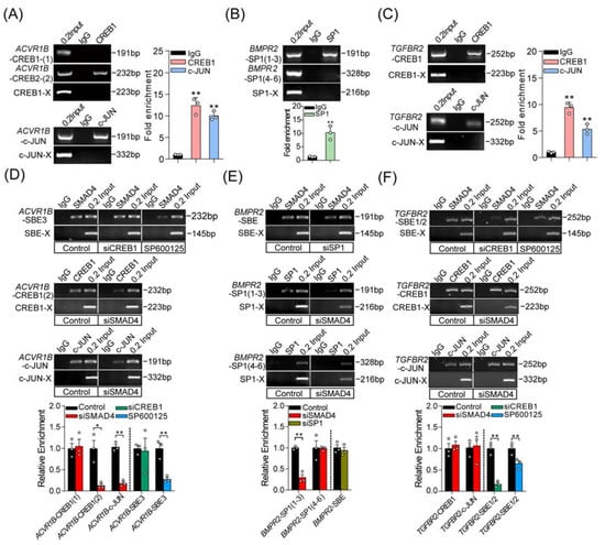 Three different interaction modes are identified between SMAD4 and coactivators in porcine GCs. (A–C) ChIP and ChIP-qPCR assays were performed to identify the interaction between coactivators (c-JUN, CREB1, and SP1) and the promoters of pig ACVR1B (A), BMPR2 (B), and TGFBR2 (C) (n = 3). (D–F) The interaction modes between SMAD4 and coactivators (c-JUN, CREB1, and SP1) during the SMAD4-mediated feedback regulation the transcription of ACVR1B (D), BMPR2 (E), and TGFBR2 (F) were identified by reciprocal ChIP and ChIP-qPCR assay (n = 3). Different treatments in porcine GCs were indicated in the boxes. Throughout, SBE-X, c-JUN-X, CREB1-X, and SP1-X indicate the negative control for ChIP assays with corresponding primary antibodies, respectively. Data are shown as the mean ± S.D. with three independent replicates (n = 3). The significance was analyzed by a two-tailed Student’s t-test, * p < 0.05, ** p < 0.01.