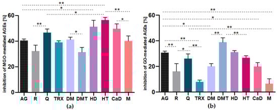 - Li, X.; Zheng, T.; Sang, S.; Lv, L. Quercetin inhibits advanced glycation end product formation by trapping methylglyoxal and glyoxal. J. Agric. Food Chem. 2014, 62, 12152–12158. [Google Scholar] [CrossRef] [PubMed]