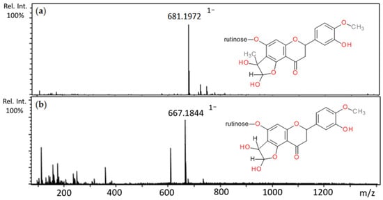 | Hesperetin 5 | a | 11.28 | 359.0771 | 341, 326, 301 | a | 12.99 | 417.0808 | 399, 301 |