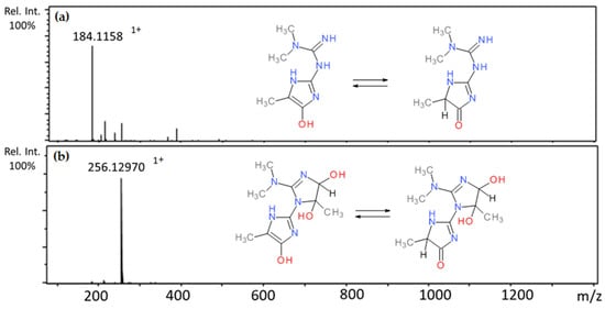 | Compound | Peak | Rt [min] | [M − H]− or [M + H]+ Mono-MGO Adduct (m/z) | MS/MS (m/z) | Peak | Rt [min] | [M − H]– or [M + H]+ Di-MGO Adduct (m/z) | MS/MS (m/z) |