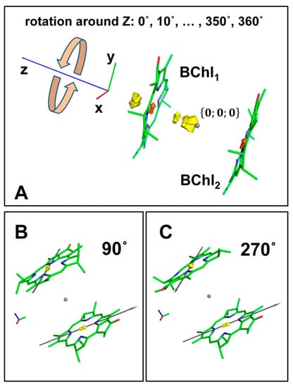 The results of the modeling are shown in Figure 2 and Figure 3 and in Table A1 of Appendix A. Plot A in Figure 2 depicts molecules in the initial positions, and the red arrows are the transition moments in coordinate representation. The yellow arrows are a set of transition moments in the exciton representation calculated for angles, , , at which the BChl2 was rotated around the z-axis. Plots B and C show two special cases, when and and coincide with each other.