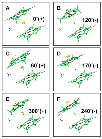 Qy transition moments of BChl dimer in the coordinate (red arrows) and the exciton (yellow arrows) representations. Gray arrows indicate the NB–ND direction in the pigment molecule. The angle of rotation and the sign of coupling (+/–) are shown for each configuration of BChl molecules. Gray points are the origins of coordinates. Dimer configurations with positive coupling are shown in (A,C,E); negative coupling in (B,D,F).