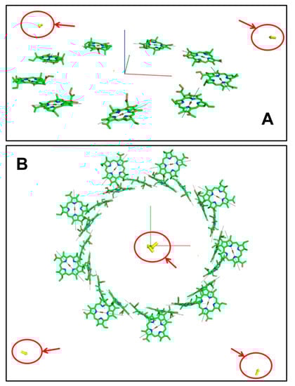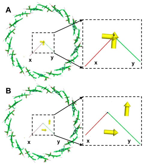 The same effect of the sign of was observed for the B800 and B850 rings. The most interesting thing was that the strongest transition moments of the B850 ring were focused in the center of the ring and perpendicular to each other (Figure 4), but those of the B800 ring were spaced apart (Figure 5A). The ideal focusing of took place for the isoenergetic Hamiltonian. It was obvious that there is always inhomogeneous broadening in a real system, and the perfect configuration of is most likely broken. However, taking into account that and were different, and borrowing these values from elsewhere [57] produced the arrangement depicted in Figure 4B. The vectors slightly moved from the center but remained perpendicular. Thus, we believe that the inhomogeneous broadening can disturb the ideal picture of exciton moments but does not destroy it completely.