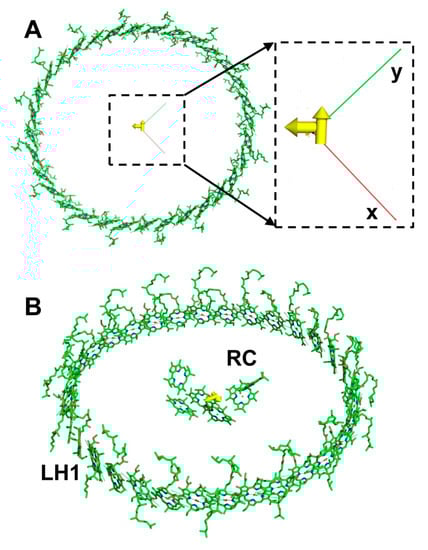 Unlike LH2, BChl molecules of the LH1 core antenna formed an ellipse-like structure and had C2 symmetry; however, this feature did not affect the positions of the most intense exciton transition moments, just like in the B850 ring, at the center of LH1-RC complex, where the RC is located. In light of these results, it is clear why LH1-RC is similar to the B850 ring mutual orientation of BChl molecules in the core antenna—to focus the moments of the most intense exciton states around the location of the RC, thus providing effective energy transport from the antenna to the RC and decreasing the probability of reverse energy flow. It is worth mentioning that the moments of the lowest exciton energies of LH2 and LH1 were located approximately in the center mass, which can also be considered an advantage in the case of the LH1-RC complex.