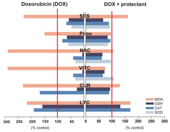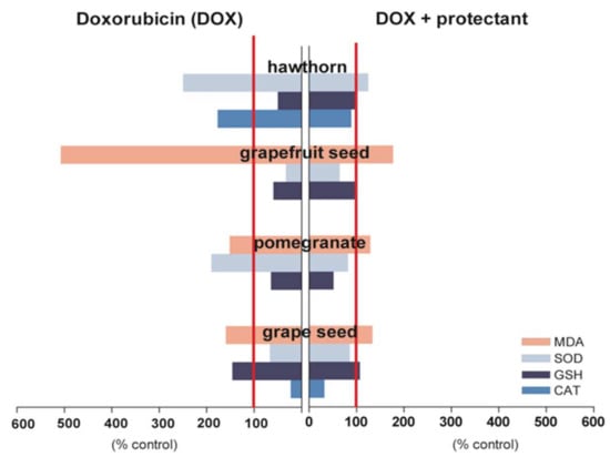 The oxidative-stress-associated cardiotoxic effects of DOX (left-hand side bars) are compared with cardioprotective activity of bioactive phytochemicals (right-hand side bars). Phytochemicals decreased MDA formation stimulated by DOX (control MDA values ranged from 57.7 to 1179 nmol/g protein). The tested cardioprotectants restored the level of GSH reduced by DOX (control GSH values range was from 0.01 to 99.8 μmol/g protein), as well as normalized activity of antioxidant enzymes SOD and CAT (100% CAT and SOD were in the range of 5.82 to 12.35 U/mg protein and from 1.10 to 8.69 U/mg protein, respectively).