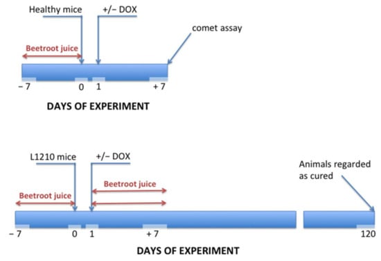The cardioprotective properties of beetroot were tested in leukemia-bearing mice treated with DOX []. Two experimental schemes were tested (Figure 3). In the first, healthy mice were given beetroot juice to drink ad libitum instead of water for 7 days, then were administered a toxic dose of DOX (20 mg/kg i.p.) for 2 or 20 h. After this time, the level of DNA damage in cardiomyocytes was determined. The results of comet assay revealed very strong DNA fragmentation in the cardiomyocytes of the mice treated with DOX. This genotoxic effect was significantly decreased in the animal groups treated with anthracycline in conjunction with beetroot juice.