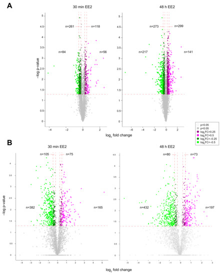 Volcano plots of proteomic (A) and phosphoproteomic (B) changes following 100 nM EE2 for 30 min or 48 h. p = 0.05 is indicated by the horizontal dotted red line, open circle plot points are non-significant (p > 0.05) and closed circle plot points are significant (p < 0.05). The log2 fold change (FC) is indicated by the colour of plot points, vertical dotted red lines indicate 0.25 and 0.5 log2FC. Purple = log2FC > 0.25, pink = log2FC > 0.5, dark green = log2FC < −0.25, green = log2FC < −0.5.