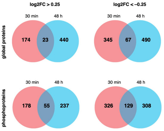 The number of proteins and phosphoproteins significantly upregulated or downregulated after 30 min (red) and 48 h (blue) and those similarly changed in both datasets are shown in the overlapping space.