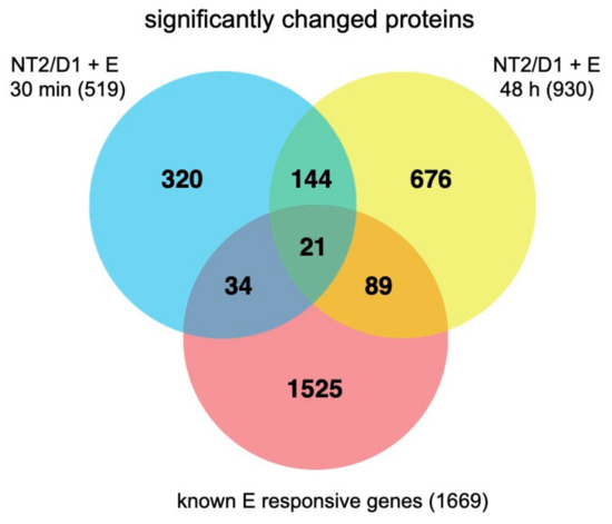 The number of proteins significantly changed in both 30 min (blue) or 48 h (yellow) of EE2 treatment datasets in NT2/D1 cells and their overlap with known oestrogen (E; red) responsive genes.