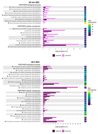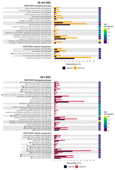 PANTHER Gene Ontology (GO) terms significantly enriched in the proteome following 30 min or 48 h of EE2 treatment. Terms clustered together by the grey/white background indicate those related by hierarchy. The horizontal bar plot denotes the percentage total number of expected and observed proteins for PANTHER biological processes and cellular components that were significantly enriched (Fishers exact test; corresponding fold enrichment show on the far right) following either 30 min (top) or 48 h (bottom) of EE2 treatment.