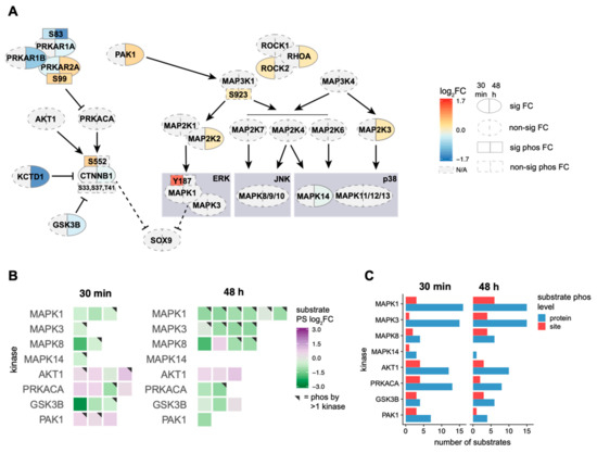 To further understand the activity of the kinases mentioned above, we assessed the fold changes to phosphorylation of their known target substrates (Figure 6B) and the number of site or protein level changes (Figure 6C). All results presented for Figure 6B,C are significant changes (log2FC difference of 0.25, p < 0.05) and shown in Tables S4 and S5. Only 5% of the phosphoproteome has identified kinases [47]. Due to this limitation, protein level changes provide an insight into the potential activity of a kinase and are important for further investigation. Although MAPK1 had an increase in phosphorylation at an activation site, its known target substrates showed an overall decrease in phosphorylation at both timepoints. This trend in decreased phosphorylation of target substrates was the same for MAPK3, which together with MAPK1 forms the ERK1/2 complex. Many of the substrates targeted by ERK1/2 were also substrates for other kinases, suggesting the overall decrease may not be due to an alteration in ERK1/2 kinase activity. Despite this, examination of protein level phosphorylation demonstrated that MAPK1 and MAPK3 had the largest number of substrates exhibiting a significant change, suggesting that there is very likely a change to their activity.