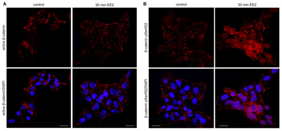 2.5. β-Catenin pSer552 Is Localized to the Nucleus Following EE2 Treatment, but Non-Phosphorylated β-Catenin Remains Unchanged
