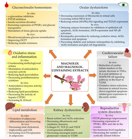 Beneficial effects of magnolol and magnolol-containing extracts on diabetes and diabetes-related condition are summarized in the Figure 2.