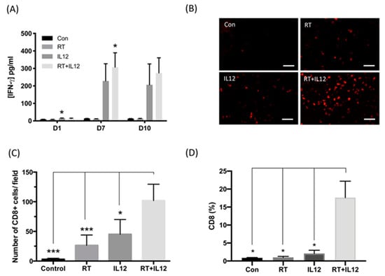 The level of IFN-γ production in blood was examined on the indicated days after treatment, as an index of Th1 response, to assess the promotive effect of IL-12 on the activity of RT against TRAMP-C1 tumors. Following monotherapy with RT, the amount of IFN-γ in blood was low at all time points and not significantly different compared with that measured in the control group. Nonetheless, the levels of IFN-γ in blood were slightly increased at day 1 after the administration of the Ad-sc-IL12 virus and peaked at day 7, regardless of treatment regimen: IL-12 alone (228.7 ± 98.04 vs. con: 13.51 ± 0.85 pg/mL, p = 0.0703) or combined modality therapy (307.3 ± 82.06 vs. con: 13.51 ± 0.85 pg/mL, p = 0.0135). Sustained IFN-γ levels were found until day 10 after treatment: IL-12 alone (206.5 ± 119.2 vs. con: 12.97 ± 0.72 pg/mL, p = 0.1965) and combined modality therapy (273.8 ± 86.73 vs. con: 12.97 ± 0.72 pg/mL, p = 0.0556) (Figure 2A). These results indicated that the IL-12-induced immune response was not compromised by RT.