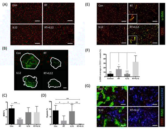 IL-12 therapy exerts anti-tumor immunity and has anti-angiogenic ability. To investigate the anti-angiogenic role of IL-12 in TRAMP-C1 tumors, the microvascular density (MVD) of tumors at day 7 after treatment was quantified by staining with endothelial cell marker CD31 (Figure 3A). Based on our previous report, RT significantly decreased the MVD in TRAMP-C1 tumors compared with control tumors. In contrast, IL-12 alone led to a slight and nonsignificant decrease in vessel density (Figure 3A,C). More interestingly, the combined modality therapy did not effectively reduce the MVD, even in tumors irradiated with high-dose RT. To further assess the anti-angiogenic effect of the combined modality therapy, the relative MVD was examined on days 1, 7, and 10 post treatment (Supplementary Figure S1). High-dose RT decreased the relative MVD to 80%, 52%, and 45% at days 1, 7, and 10, respectively, after irradiation compared to the values obtained for the control group. IL-12 alone decreased the MVD until day 7 post treatment; however, the difference was not significant. In those that received combined modality therapy, the MVD did not change at day 1, slightly decreased at day 7, and significantly declined at day 10 post RT, similar to the RT group. This result suggested that IL-12 may delay the death of endothelial cells induced by RT. Furthermore, the combined modality therapy resulted in an extremely low hypoxic area in tumors versus other groups (Figure 3B,D). This implied that the vessels in tumors of mice that received combined modality therapy may have good perfusion function. To test this hypothesis, tumor vessels were examined using pericyte coverage and the pattern of Hoechst33342 dye perfusion for structural and functional analysis, respectively (Figure 3E,G). The integrity of tumor vessels was determined through the coverage of CD31+ endothelial cells by α-smooth muscle actin-positive (α-SMA+) pericytes (Figure 3E). Tumors from the control and IL-12 alone groups had low α-SMA+ expression and low levels of pericyte coverage (Figure 3F). RT increased the coverage of endothelial cells by α-SMA+ pericytes and improved the vascular perfusion (Figure 3F,G), suggesting vascular normalization after RT. More α-SMA+ cells were recruited into tumor sites of mice that received the combined modality therapy, and the level of coverage of CD31+ cells by α-SMA+ pericytes was significantly higher than those recorded in the other three groups (Figure 3F). These effects were accompanied by a well-perfused tumor microenvironment detected through Hoechst33342 dye perfusion (Figure 3G).